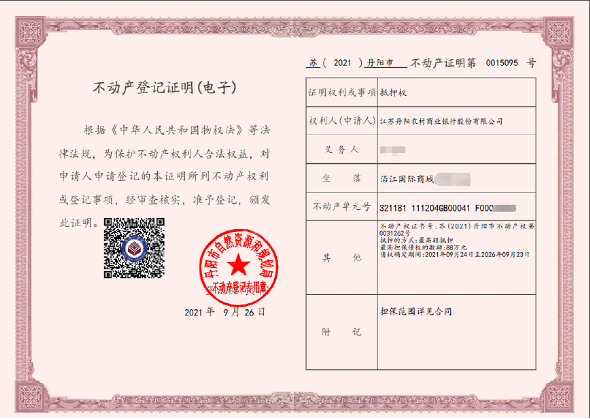 9月26日,丹阳农商银行实现了镇江地区首张线上不动产抵押登记电子他项权证的发放。